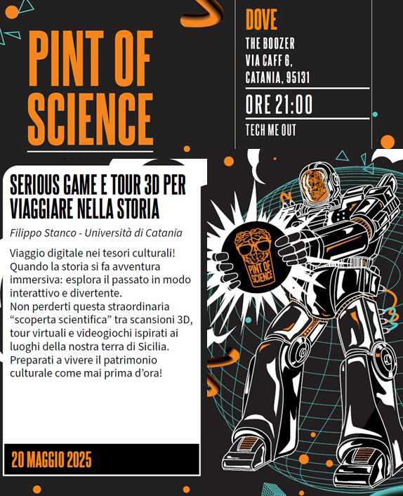 Il 20 maggio 2025 alle ore 21, il prof. Filippo Stanco terrร un incontro da titolo "Serious game e tour 3D alla scoperta dei tesori culturali - Viaggio digitale nei tesori culturali! Quando la storia si fa avventura immersiva: esplora il passato in modo interattivo e divertente. Non perderti questa straordinaria "scoperta scientifica" tra scansioni 3D, tour virtuali e videogiochi ispirati ai luoghi della nostra terra di Sicilia."