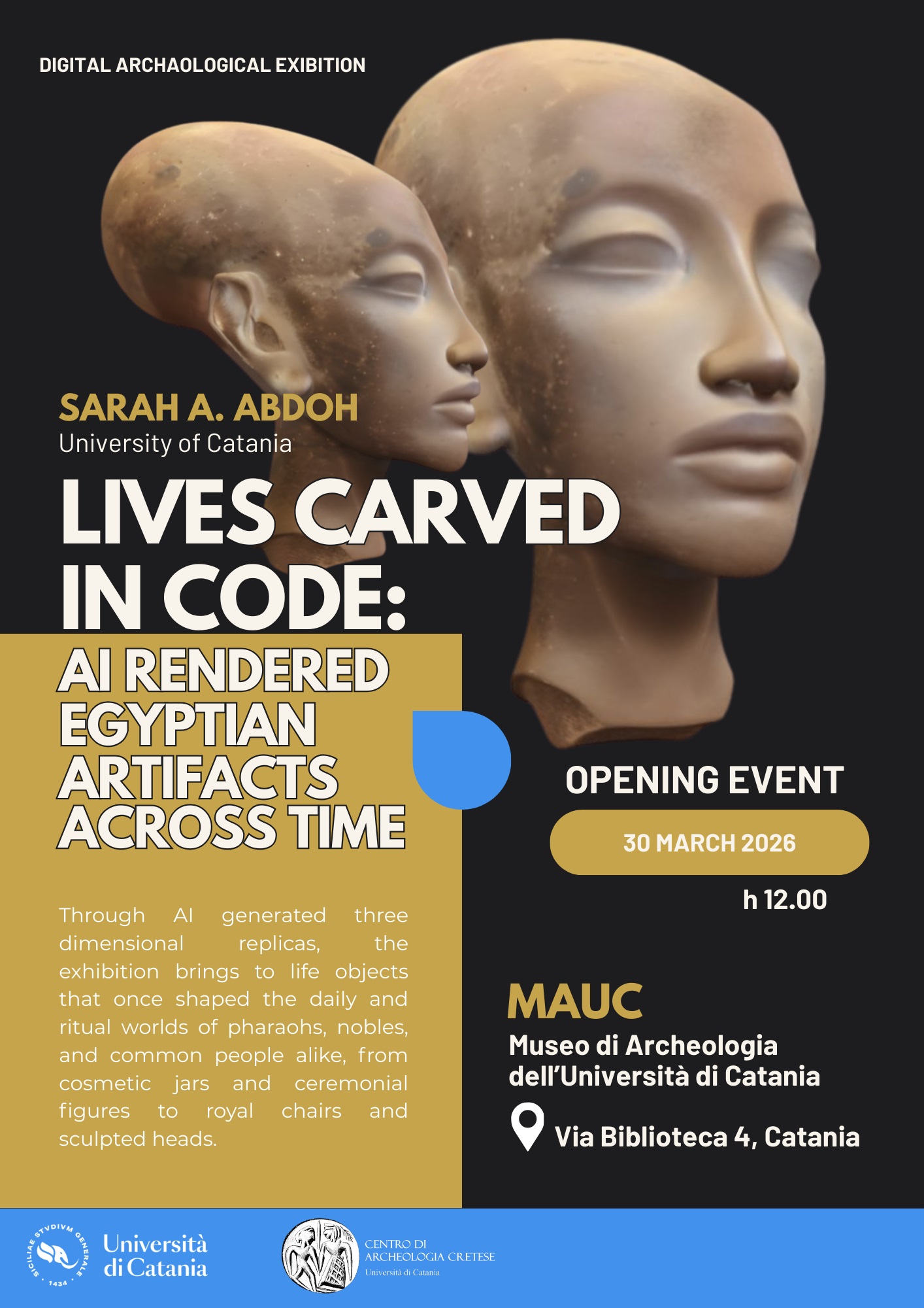 Il 30 marzo verrà inaugurata la mostra “Lives Carved in Code. AI Rendered Egyptian Artifacts Across Time”, organizzata da Sarah Abdoh, Professore associato presso il "Sculpture, Architectural Formation and Restoration Department", Faculty of Applied Arts, BU, Egitto. La mostra esplora l’intersezione tra il patrimonio dell’antico Egitto e la creazione digitale contemporanea. Attraverso repliche 3D generate con l’intelligenza artificiale, riporta in vita oggetti che un tempo facevano parte del mondo quotidiano e rituale di faraoni, nobili e persone comuni. Ogni manufatto, ricostruito nello spazio digitale, diventa memoria del passato e al tempo stesso interroga la natura dell’autenticità, della memoria e della materialità, invitando a riflettere su come la storia possa essere conservata, interpretata e reimmaginata. Vi aspettiamo il 30 marzo alle ore 12:00 a Palazzo Ingrassia in aula Vincenzo La Rosa e a seguire presso il MAUC (Museo di Archeologia dell’Università di Catania), Via Biblioteca 4, Catania.