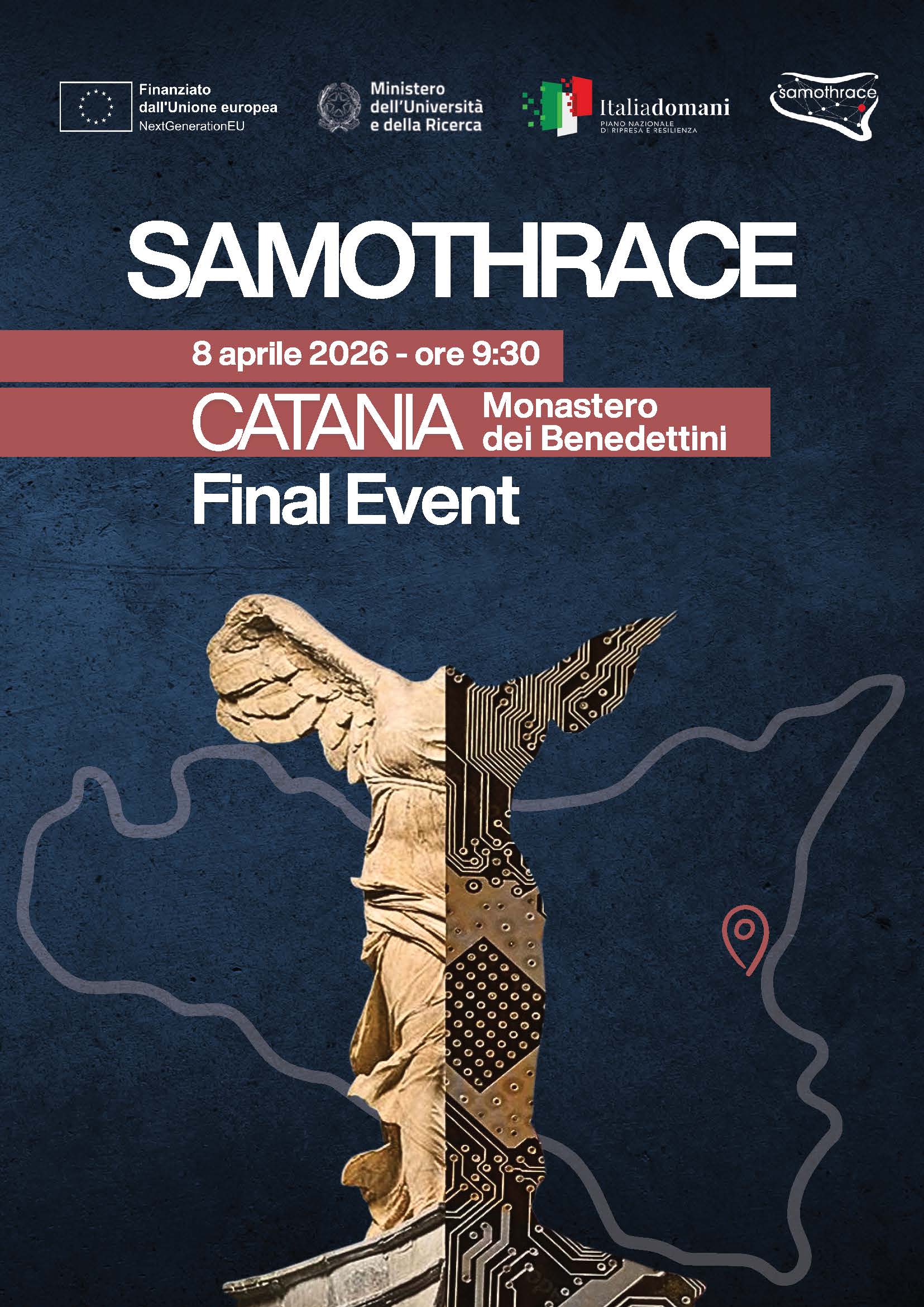 Ci vedremo giorno 8 aprile a partire dalle 09.30 e fino alle 1500 presso l’Aula Santo Mazzarino del Monastero dei Benedettini, Catania, per i saluti istituzionali, una presentazione di sintesi dell’attività di questi anni e per una tavola rotonda tra i responsabili dei nove spoke del progetto Samothrace. A partire dalle 12.30 e fino alle 15.00, presso il Chiostro di Levante del Monastero dei Benedettini, avrà luogo la sessione demo con selezione dei prototipi realizzati nel corso del progetto e che hanno raggiunto una più elevata maturità tecnologica.